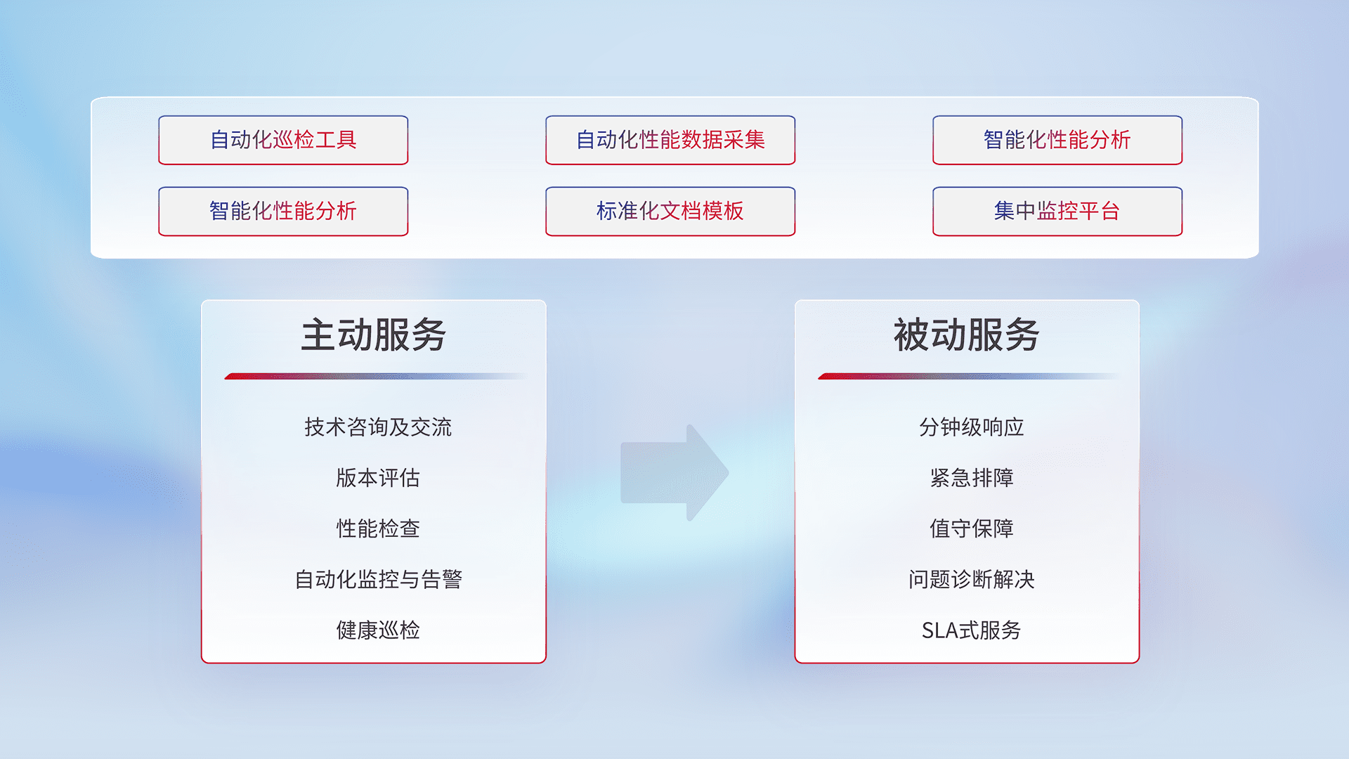 智能化工具和标准化文档,,,,保障服务质量,,提供主动服务(包含技术咨询、、版本评估、、、、性能检查、、、自动化监控与告警、、、、健康巡检)和被动服务包含(分钟级响应、、、紧急排障、、值守保障、、、问题诊断解决、、、、SLA服务)。。。。